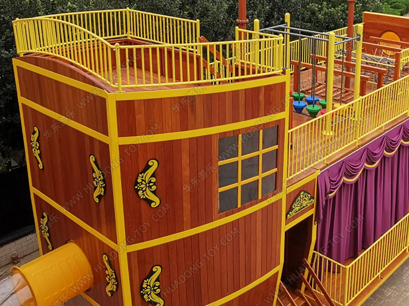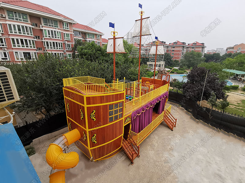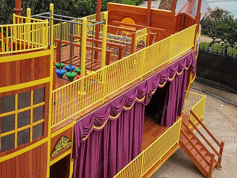 • 北京幼儿园案例是一个以海盗船为模型设计的游乐设施,该项目整体采用木质结构进行设计,改变了以往海盗船的设计风格,为结合整个场地的合理化利用,新增了演出舞台、平衡荡桥、组合滑梯、钻洞爬网、踩桩 等游乐设备。