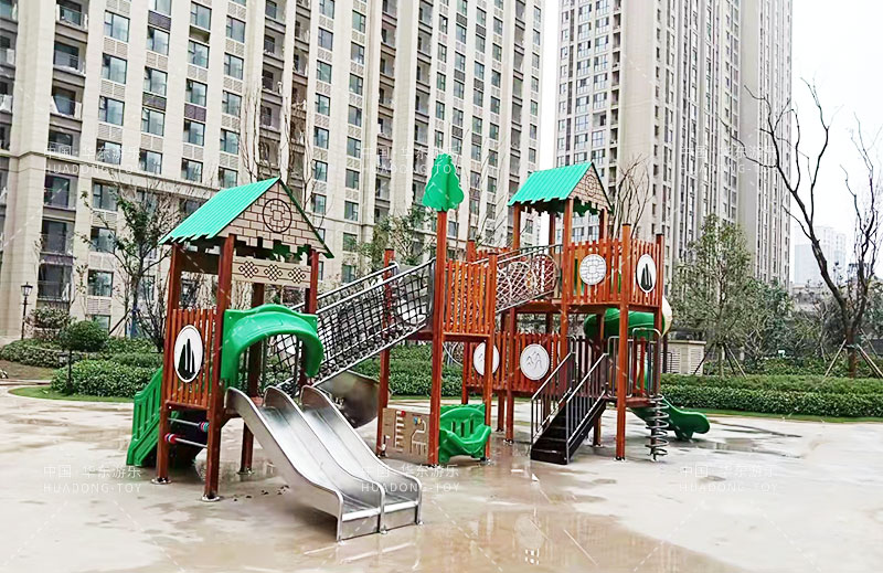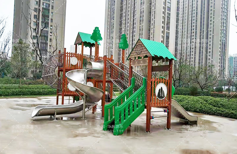 荣盛华府选用的是kaiyun开云游乐自主设计的具有攀爬网、U型爬网、不锈钢滑梯、网桥、滑桶为一体的综合性游乐设备。