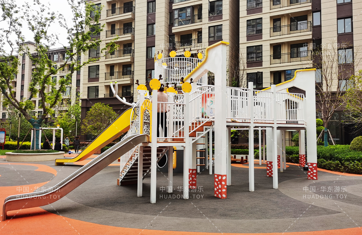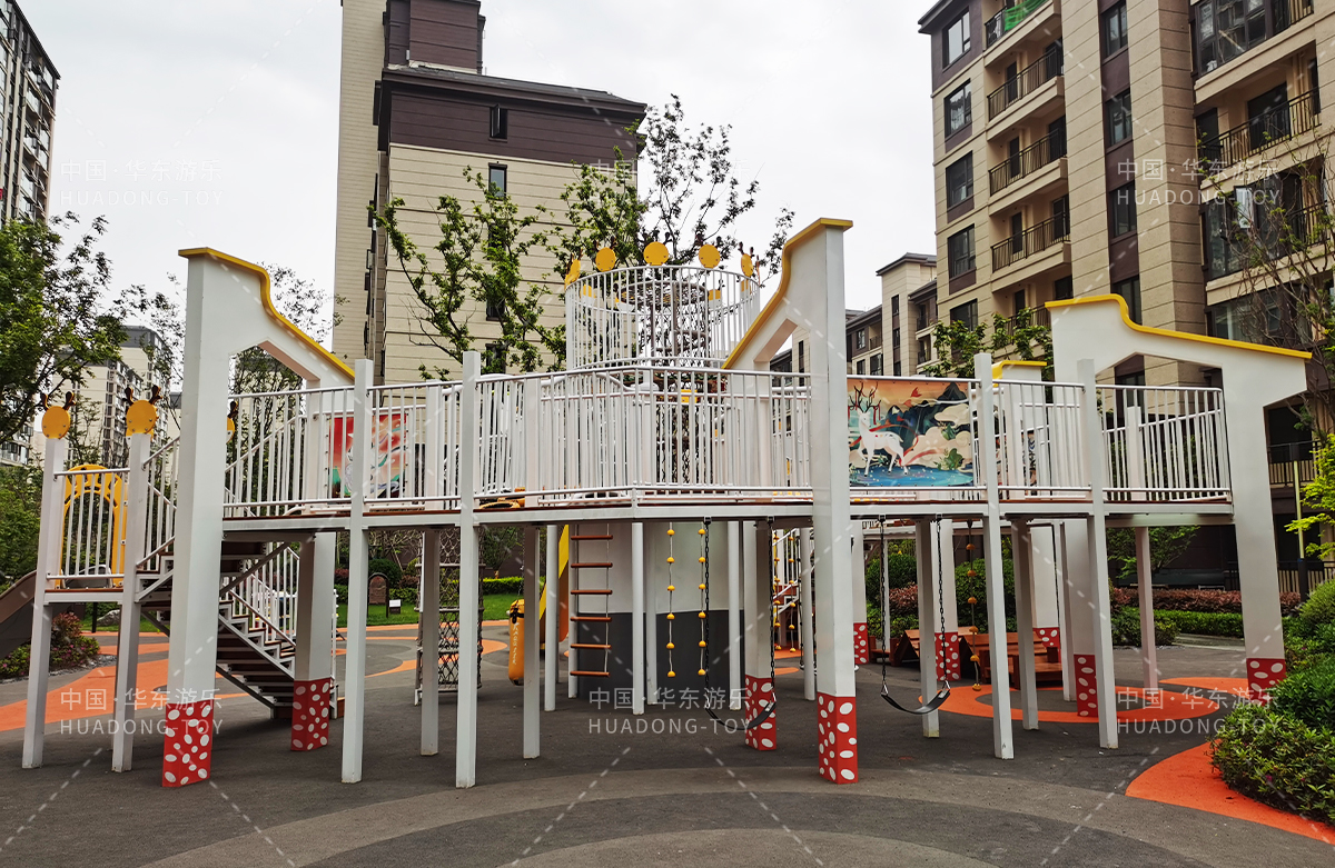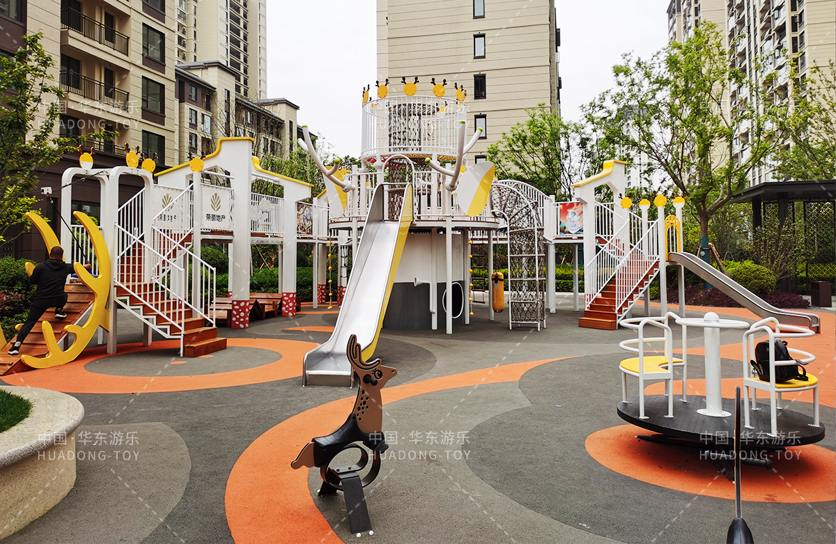 东方名府云著此次选用的是kaiyun开云游乐自主研发和生产的无动力游乐设备,采用的是以麋鹿为主题的综合性游乐园,整个游乐园分别设计了小朋友喜欢的儿童跷跷板、打击乐器、儿童摇摇乐,以及和具备不锈钢滑梯、攀爬网、攀爬绳、攀爬梯等功能的麋鹿组合滑梯等游乐设备。