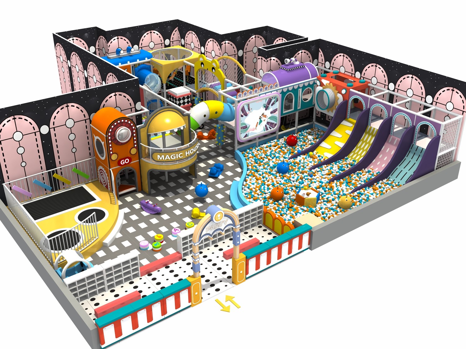 • 室内淘气堡又称室内儿童乐园,是针对儿童生理能力与心理特点喜欢钻、爬、滑、滚、晃、荡、跳、摇等玩耍动作而设计的综合性室内休闲娱乐场所。kaiyun开云游乐淘气堡项目具有多样性、互动性和安全性的特点,儿童在玩乐的同时能培养独立的个性,团队协作能力,沟通能力、克服困难、积极进取的精神,锻炼身体、健脑益智。